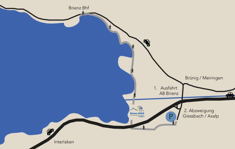 Benutzen Sie auf der A8 die Autobahnausfahrt Brienz, folgen Sie dem Wegweiser Giessbach/Axalp. Nach dem Abzweiger Giessbach/Axalp finden Sie das Parking für das Oberländische Schwingfest in Brienz.