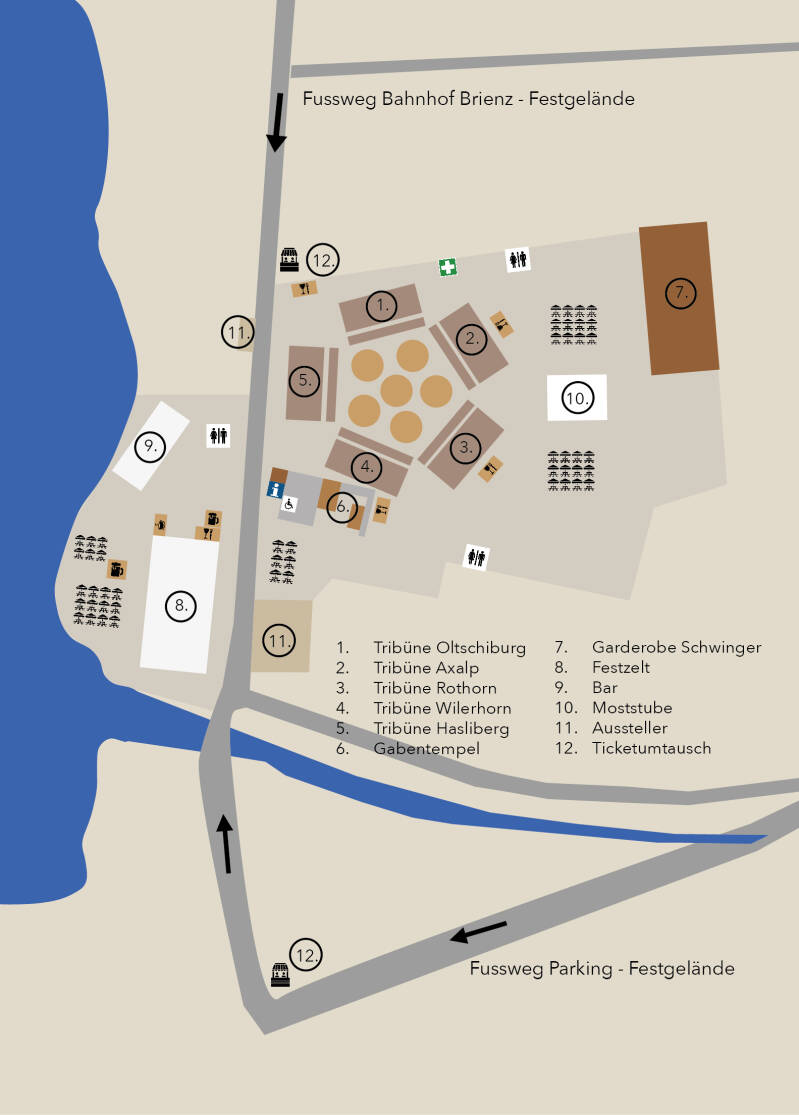Benutzen Sie den Zug bis Brienz Bahnhof (NICHT Brienz West). Von dort führt ein Fussmarsch von 25 Min. (2km) bis zum Festgelände.
